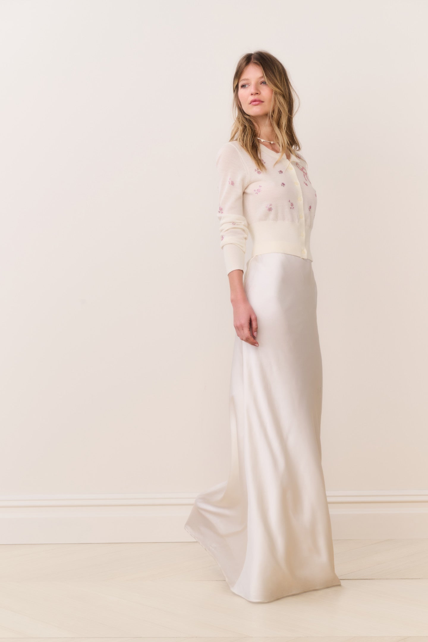 Effortlessly romantic. the Maurine Skirt debuts as part of our Secret Crush capsule. Designed from a soft. drapey charmeuse with delicate embroidered lace. this floor-length maxi moves with a slinky. fluid grace. Cut on the bias for a flattering. forgiving fit. it skims the body before gently flaring into a fishtail silhouette for subtle drama. Designed with an elastic waist for easy pull-on wear. the Maurine pairs beautifully with matching camis and delicate lace tops for an ethereal. timeless look.