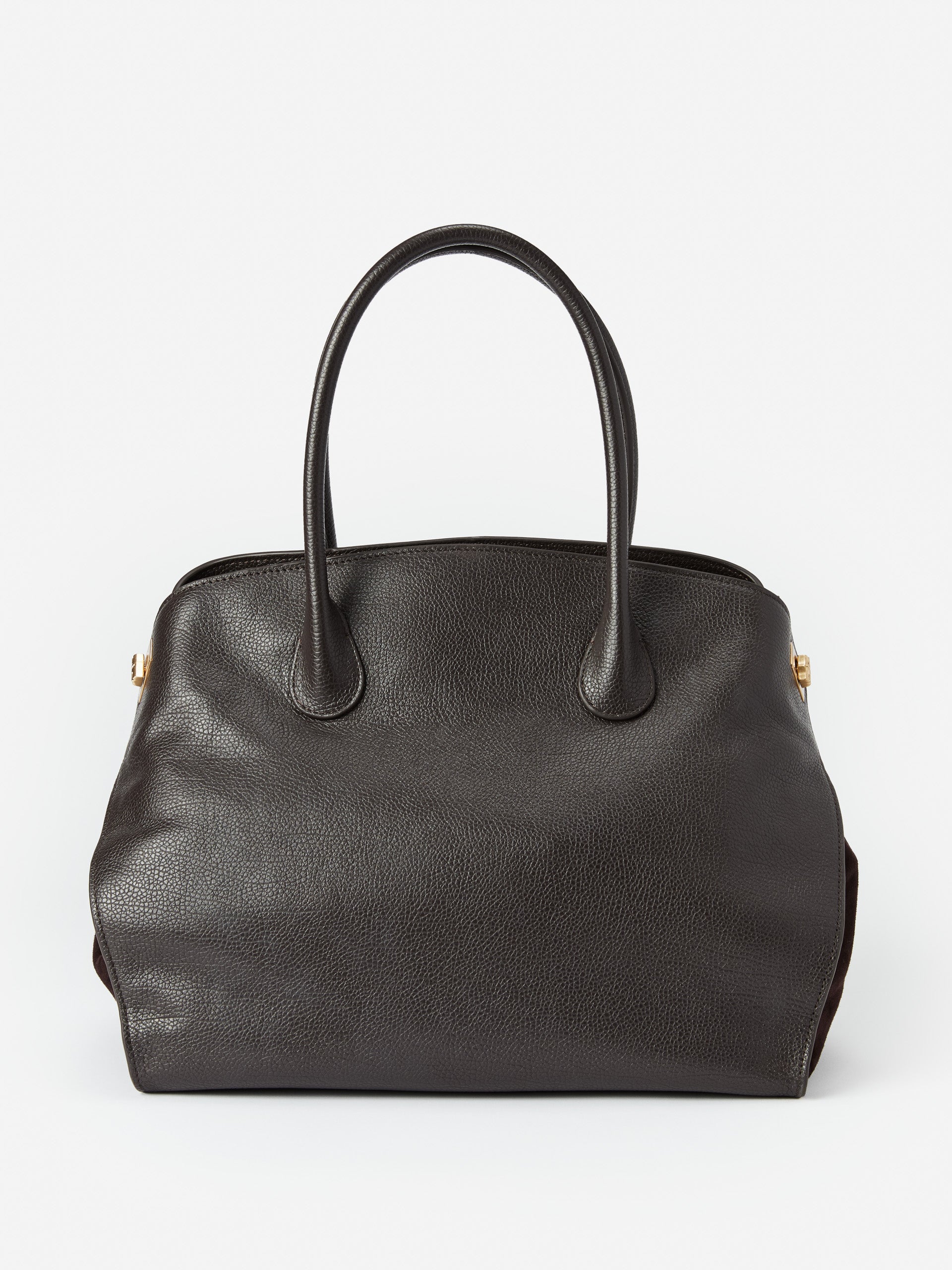 Leather tote with suede side panels Top handle Side gold turnlock closures 100% Leather, 100% Suede Lined Imported Size & Fit12.5″ width, 12″ height, 5.5″ depth, 6″ handle drop