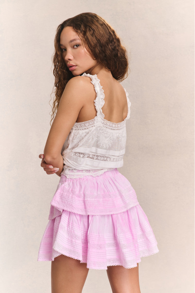 Our best selling Ruffle Mini Skirt returns for the season. She features intricate inset lace trims and allover pintuck details. The elasticated waistband and double lining offers flexibility in comfort and styling. Tiered ruffles exude effortless femininity. The mini is finished with a frayed. raw hem for added playfulness. Complete the look with our .