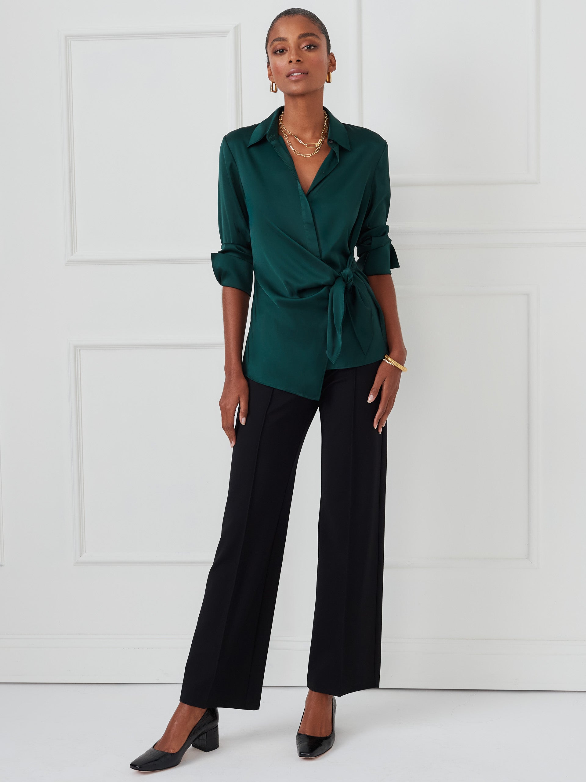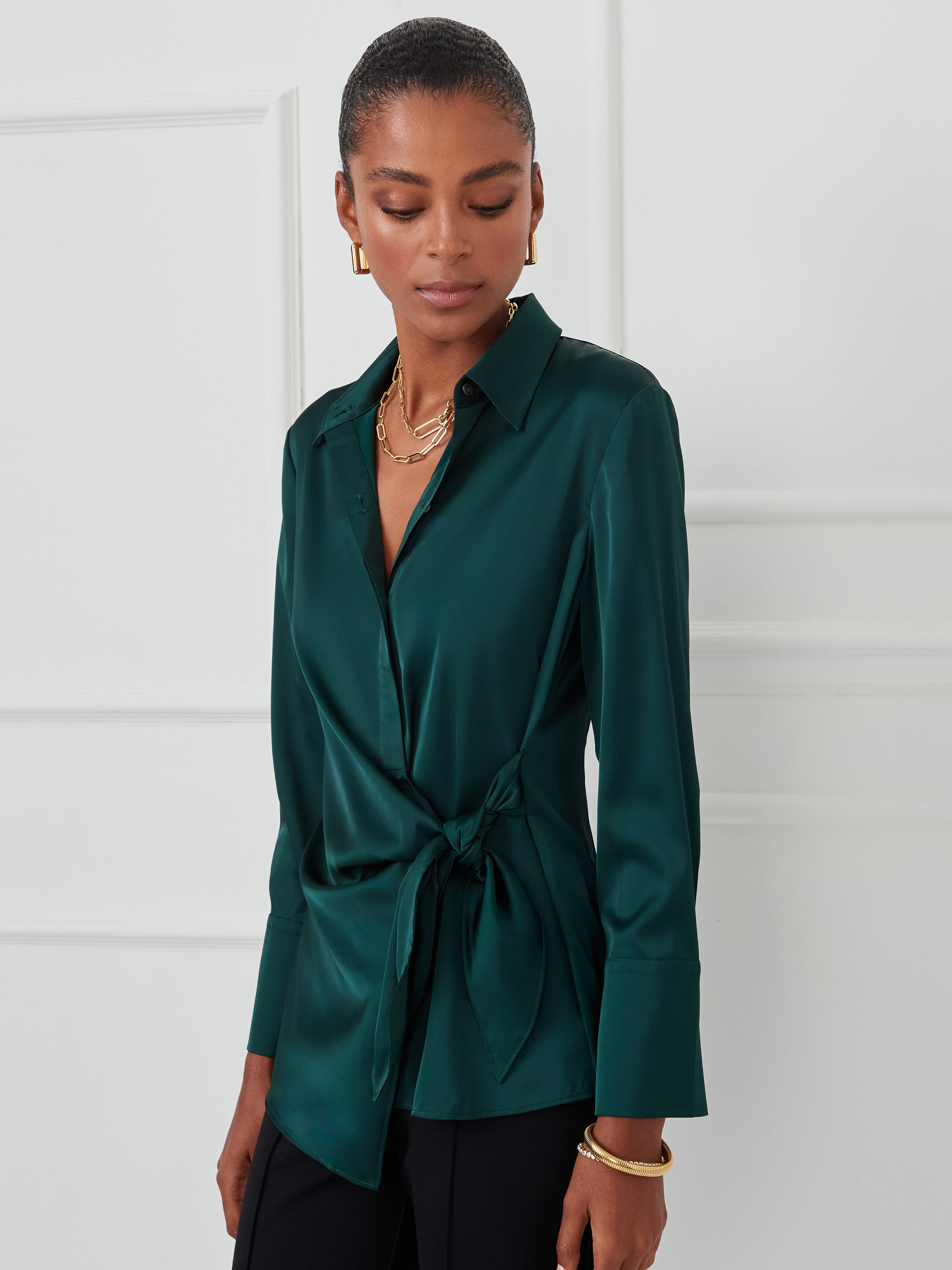 Meet the newest addition to your capsule wardrobe: the Salma, our newest iteration of the timeless button-down shirt, elevated with a tie-waist detail and crafted in a jewel-toned satin.