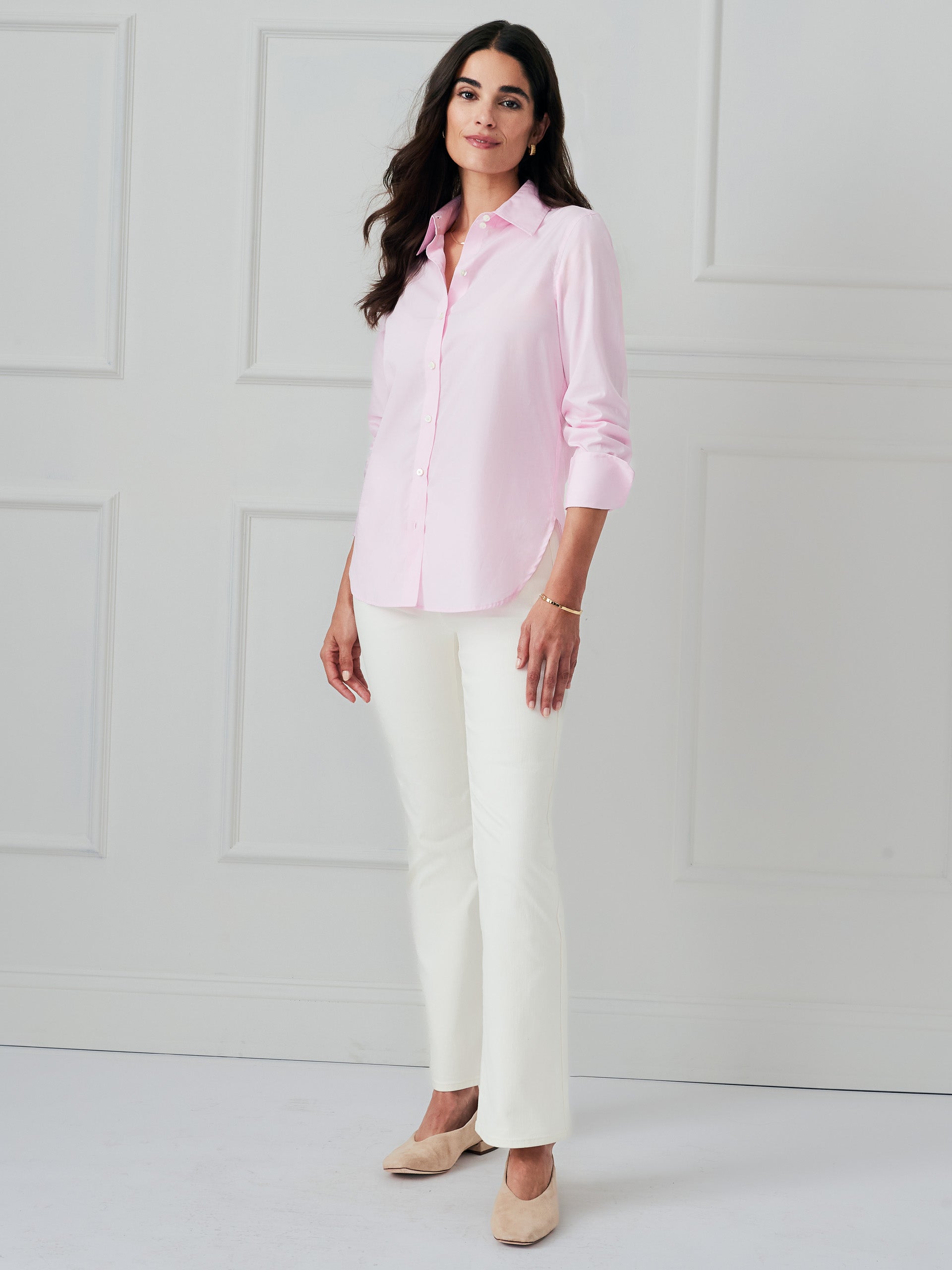 Long sleeves Shirt collar Button down Wide cuffs 100% Cotton Poplin Machine wash cold. Tumble dry low. Imported. Size & Fit26 1/2″ long from top of center back (size M) Model is 5’9″ and wearing a size XS